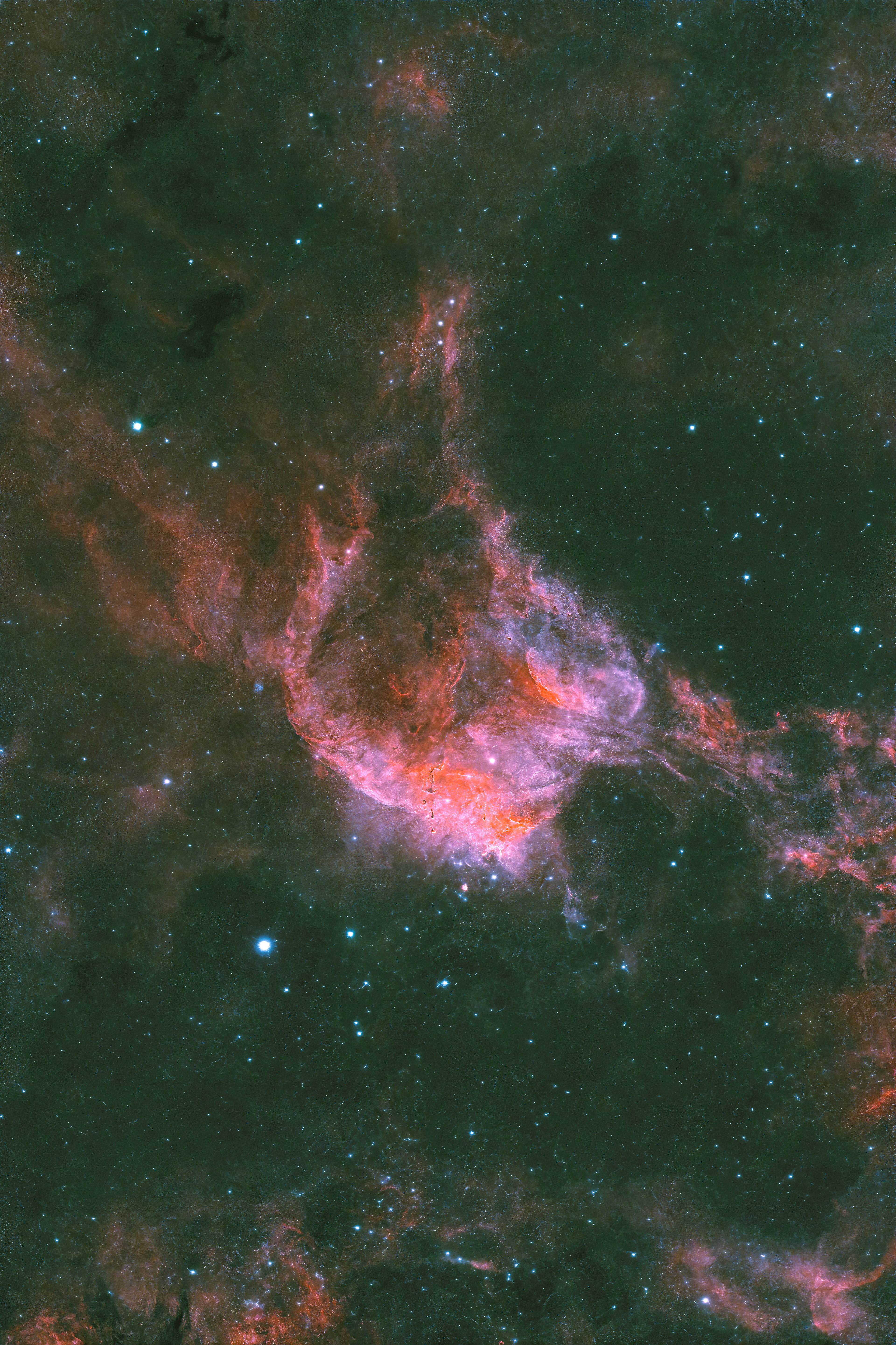 Image captured in the southern hemisphere at a Bortle 9 location with a dual narrow band filter. Mosaic image consists of 4 panels, each of 120 x 5 minutes subframes over several nights. Original processed image size in TIFF format is 340MB with the one shown here is 36MB of JPEQ format.