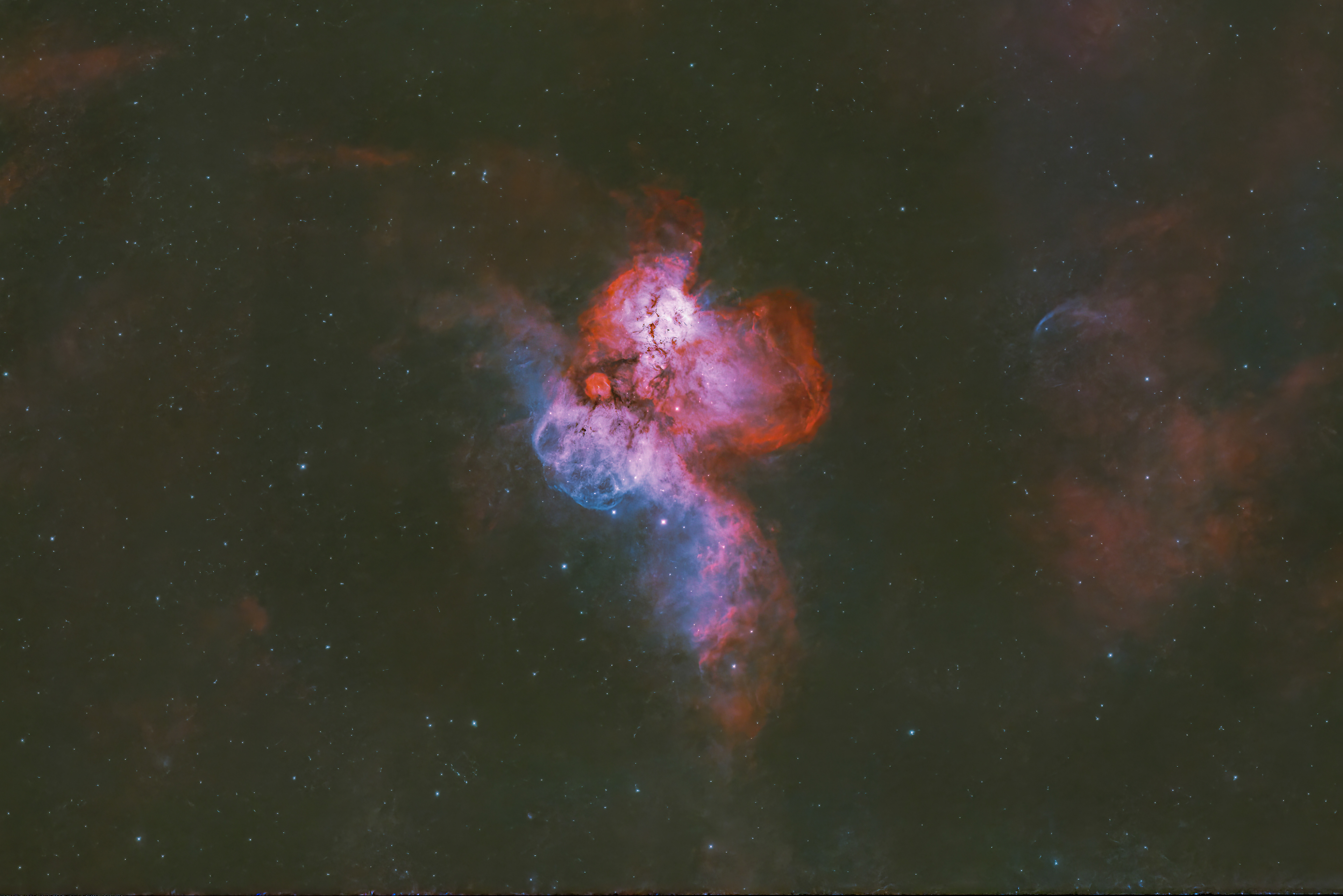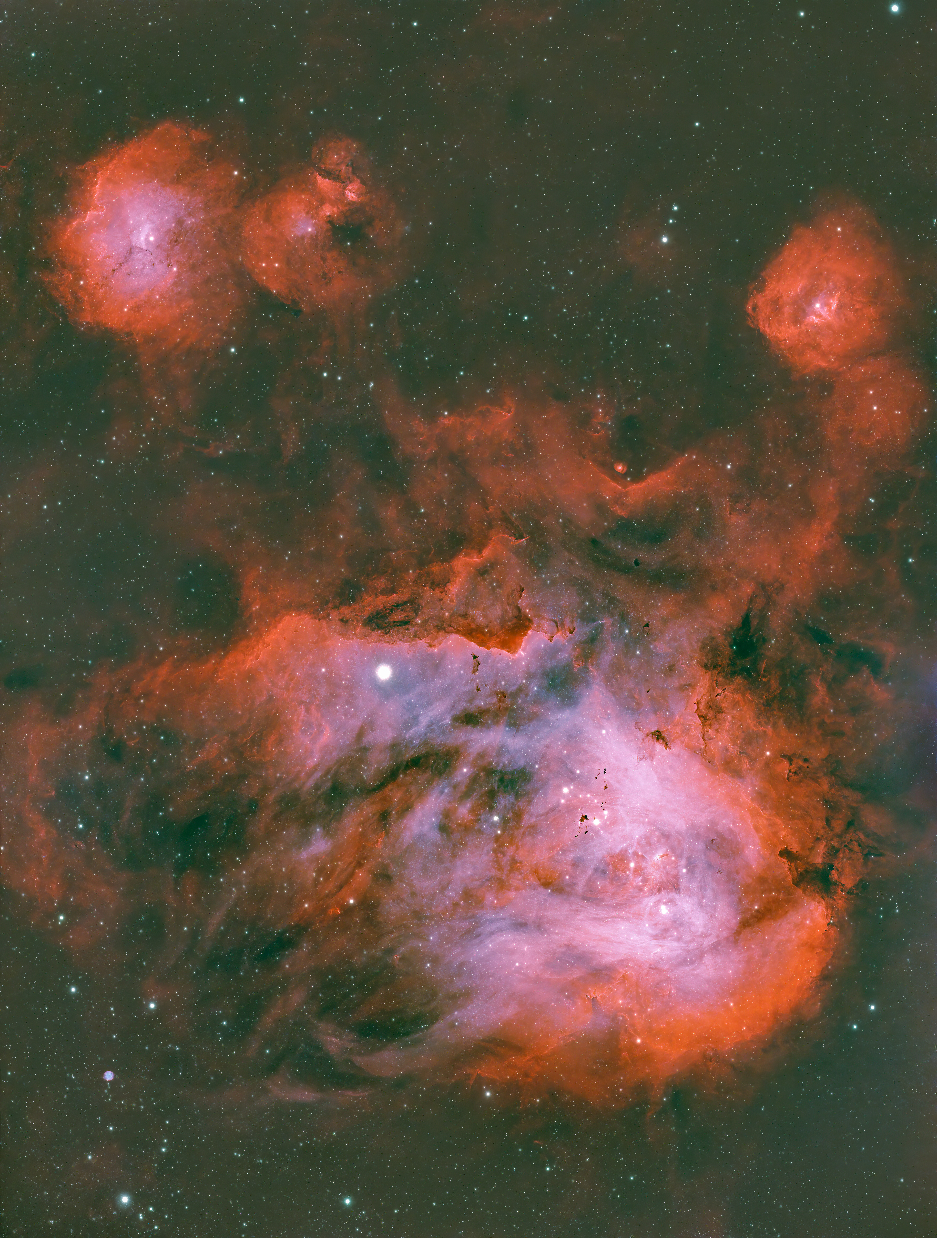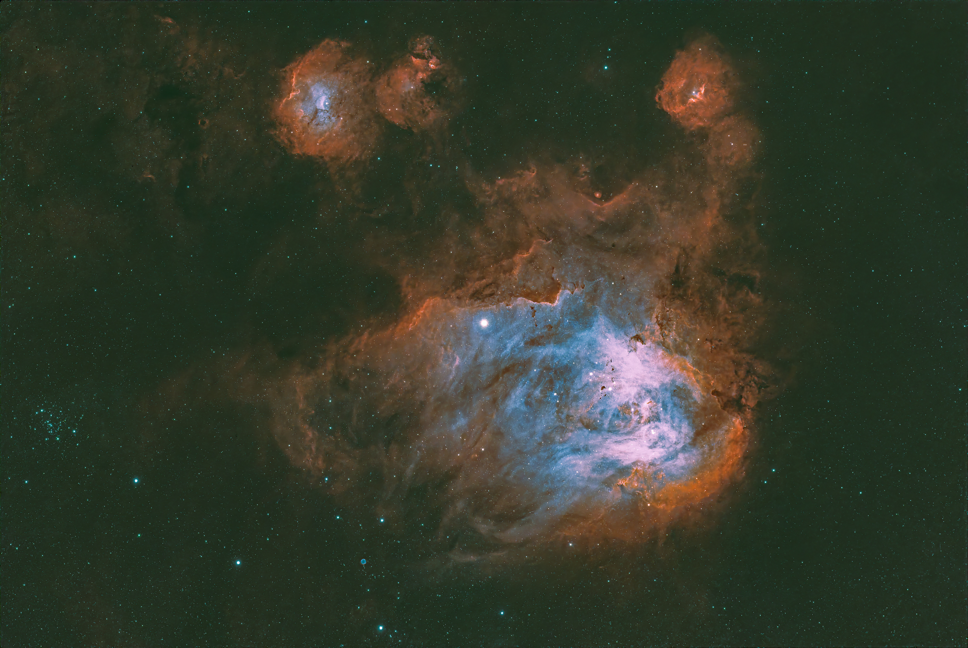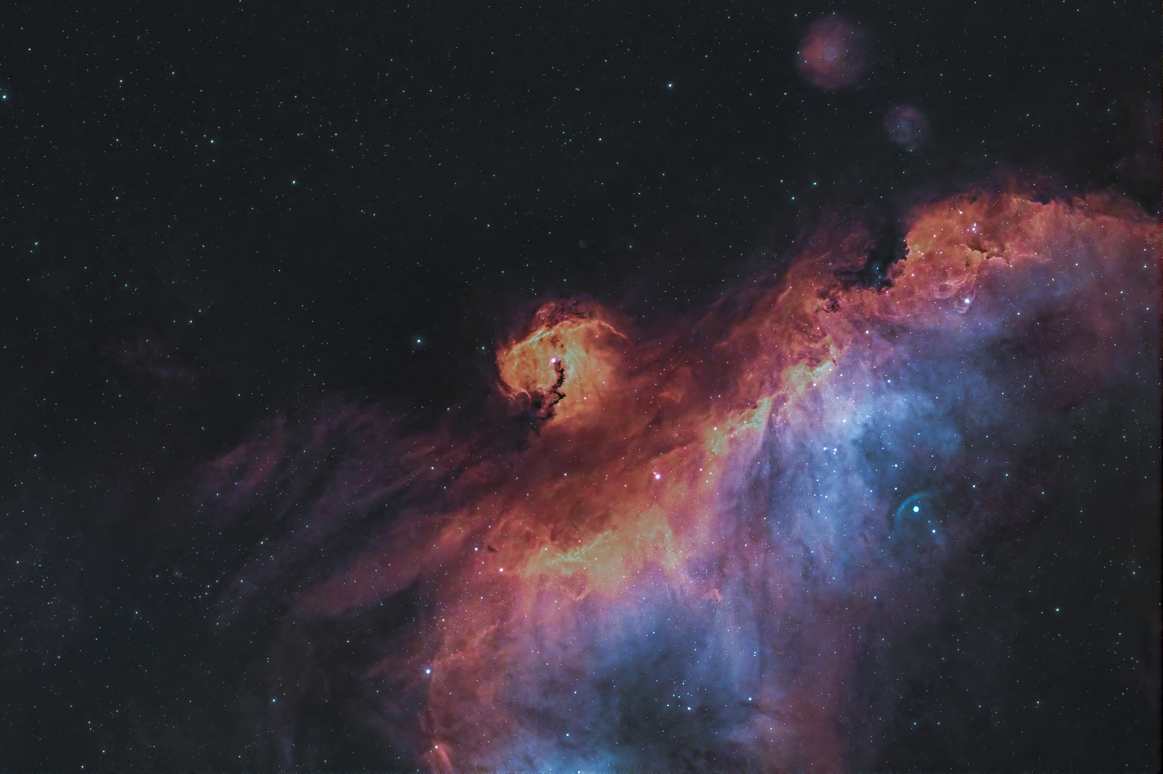 wide field starless version of omega nebula M17 in SHO Hubble palette (17, 18, 19, 20, 24 august 2023)