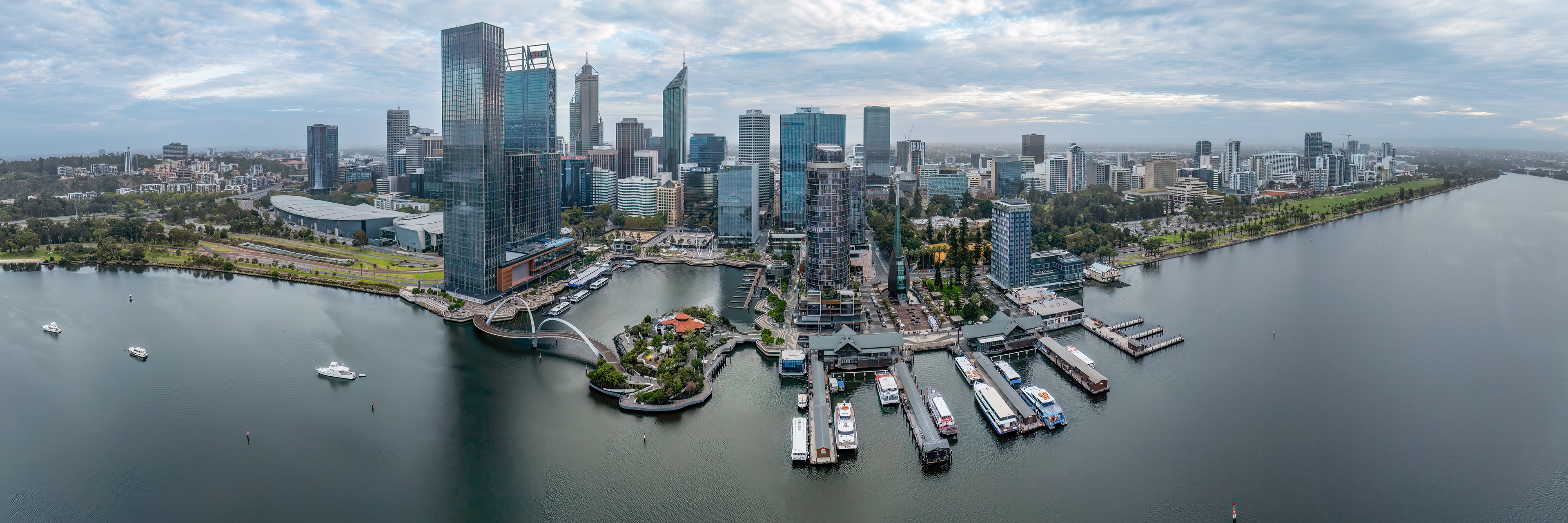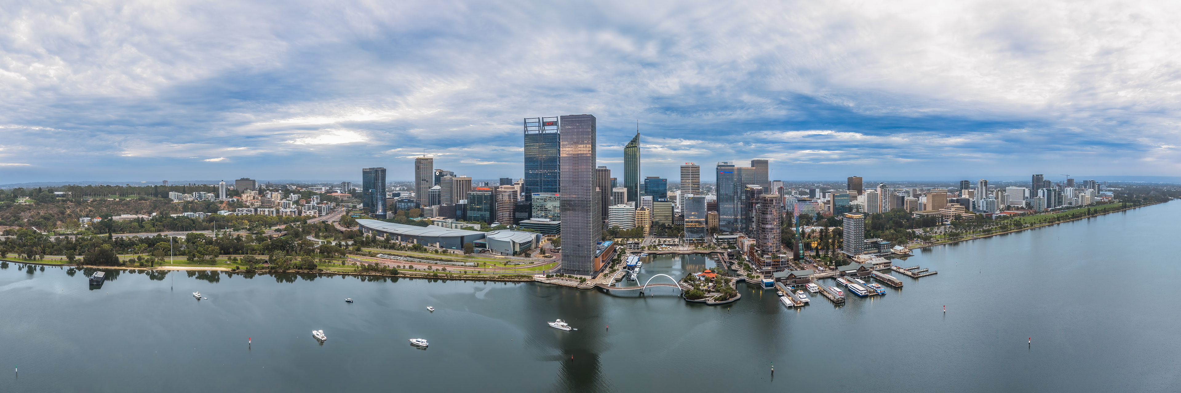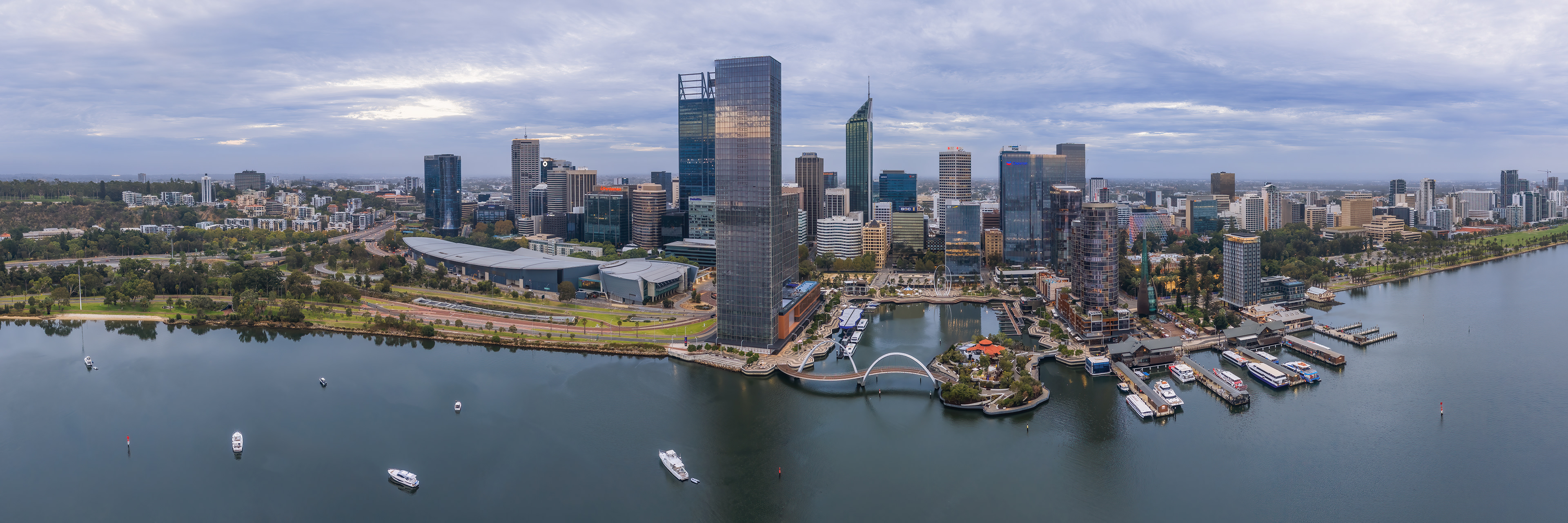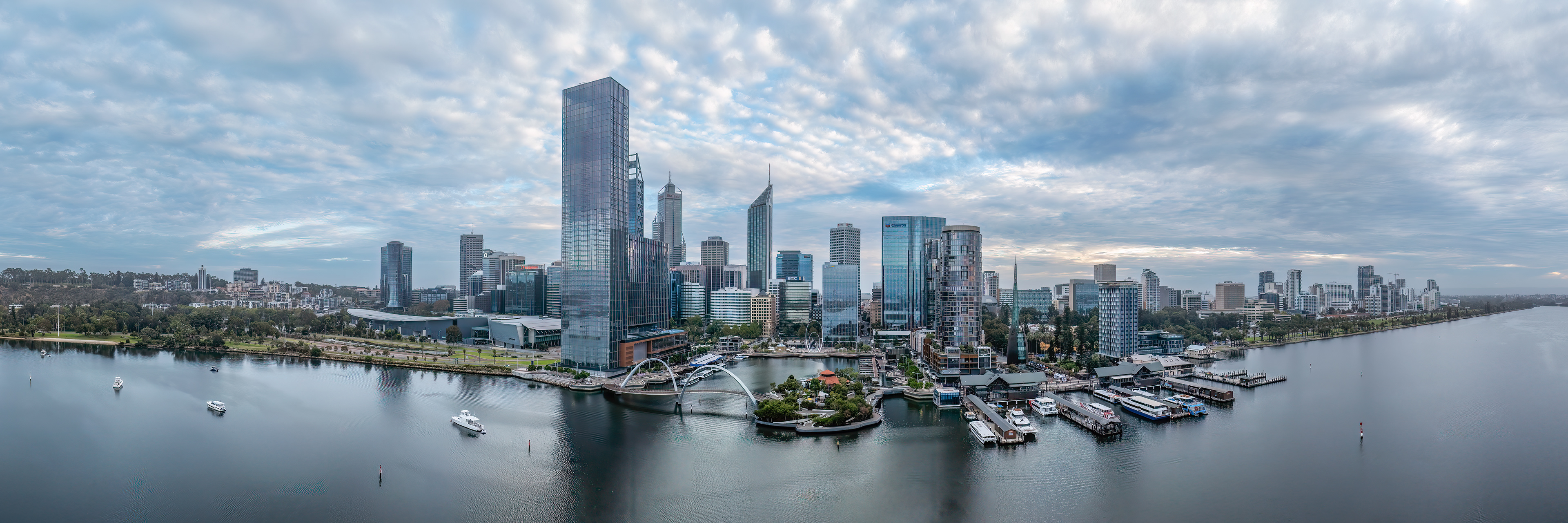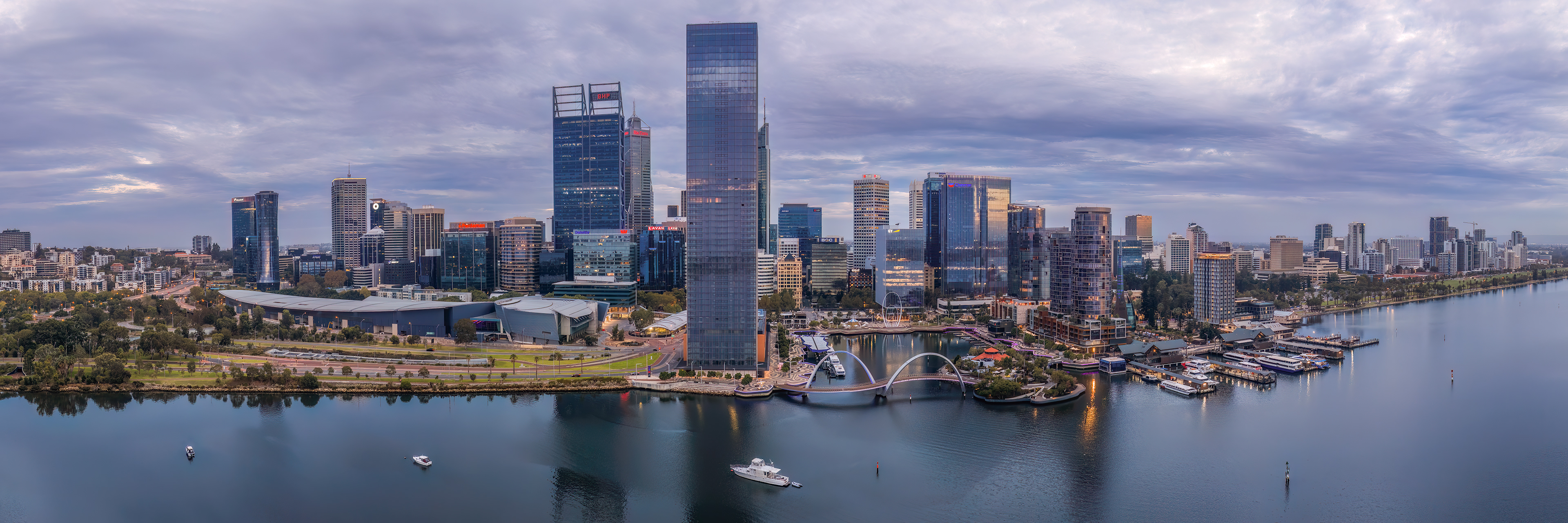 1X4 Aspect panorama taken from across the foreshore of Elizabeth Quay. South Perth foreshore is to the left, Narrows Bridge and Mount Eliza to the right. Taken with Canon R5 at f16, 70mm, ISO 100 and 1/4 seconds exposures on a Gitzo tripod with an Acratech leveller and ballhead.