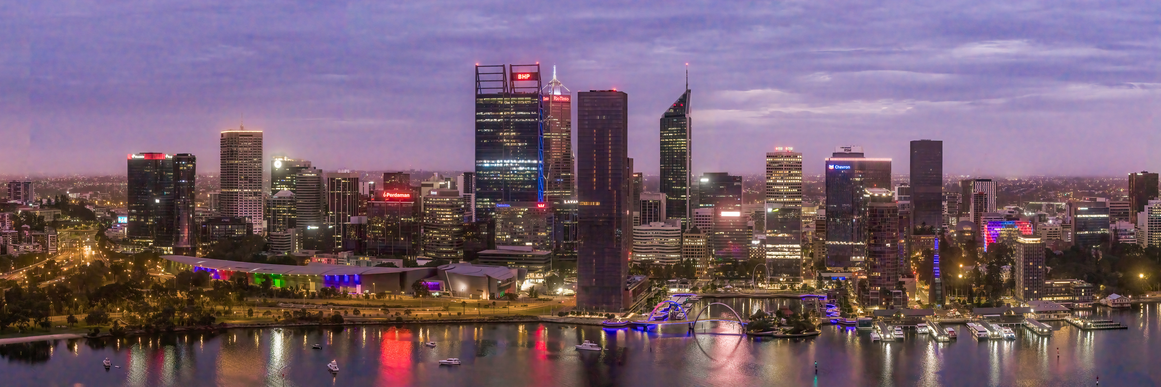 1X3 Aspect panorama taken from across the foreshore of Elizabeth Quay. Taken with Canon R5 at f11, 200mm, ISO 100 and 6 seconds exposures.